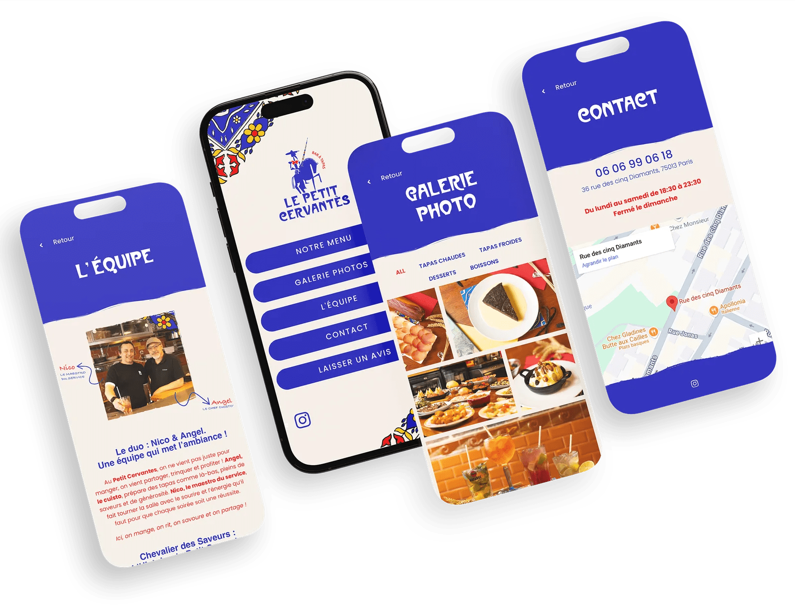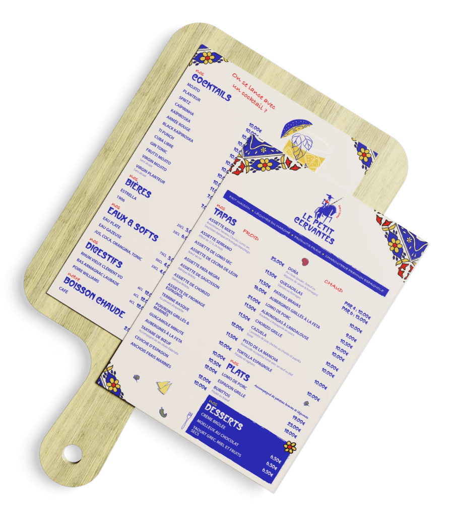 Le Petit Cervantes est un bar à tapas aux influences espagnoles fortes, où l’univers de Don Quichotte rencontre une ambiance colorée et conviviale. La refonte de son identité visuelle s’est construite en écho à la décoration intérieure du lieu, mêlant mosaïques, teintes chaudes et références culturelles. Une nouvelle image a été pensée pour traduire cette atmosphère tout en renforçant la cohérence de la marque sur l’ensemble de ses supports, du lieu physique jusqu’au digital.